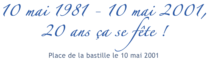 Devant un public de 25 000 personnes, à l’occasion de la célébration du vingtième anniversaire de l’élection de François Mitterrand, ce grand spectacle a mis en scène chanteurs, artistes de rue, musiciens, projections de films… La place de la Bastille fut mise en images et en lumières à 360 ° avec en final l’embrasement de la colonne de Juillet. « Une soirée placée sous le signe des rencontres, de la fête, du spectacle et du spectaculaire, de la mémoire et de l’émotion » |